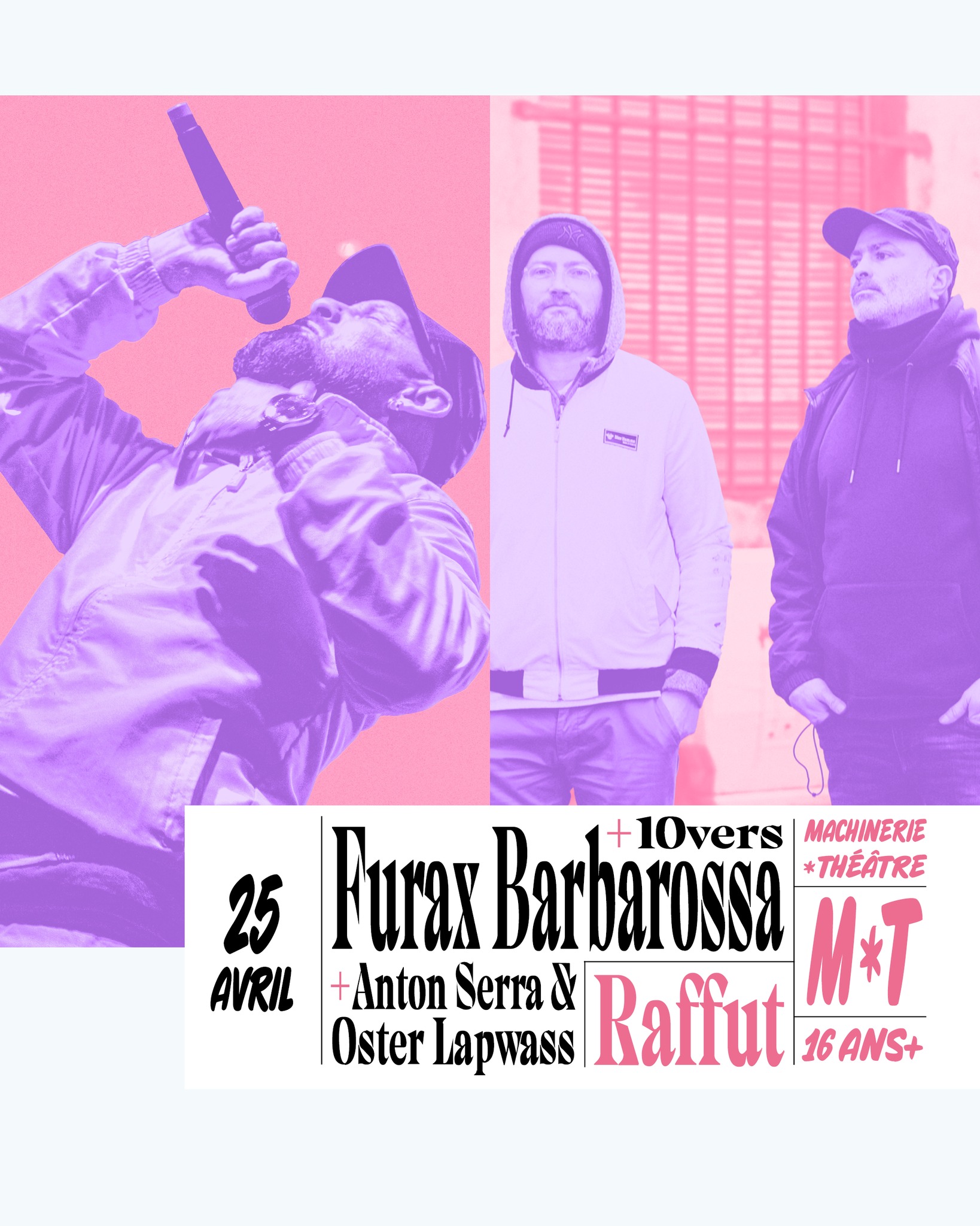 Une soirée dédiée au rap indépendant avec des artistes majeurs de la scène underground : Furax Barbarossa, figure incontournable à la plume incisive et à la présence scénique intense, Anton Serra accompagné du producteur Oster Lapwass, piliers du collectif L’Animalerie au rap introspectif et expérimental, ainsi que 10Vers, rappeur authentique et membre de Bastard Prod.